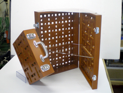 | 駅構内フリーペーパー什器 | 腰掛防止用オブジェ | 木工サイン什器(カタログポケット式) | アクリル製試聴用機材収納什器 |